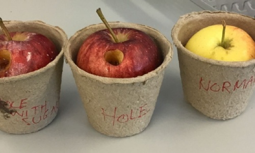 We had three apples – one clean untouched apple, one with a hole and one with a hole and sugar inside. After 24 hours, I examined the apple and found that the healthy apple was still healthy. The one with a hole changed in colour, the hole was very dark. The one with the hole and sugar made had lots of liquid (slimy).